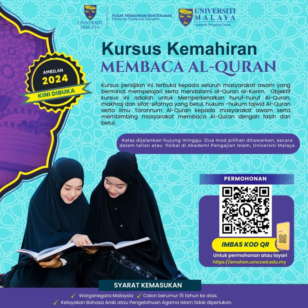 This course is offered by the Universiti Malaya Center for Continuing Education (UMCCed) and lectures are delivered by lecturers from the Academy of Islamic Studies, Universiti Malaya. This certification course is open to the public who are interested in learning and deepening their al-Quran al-Karim knowledge.